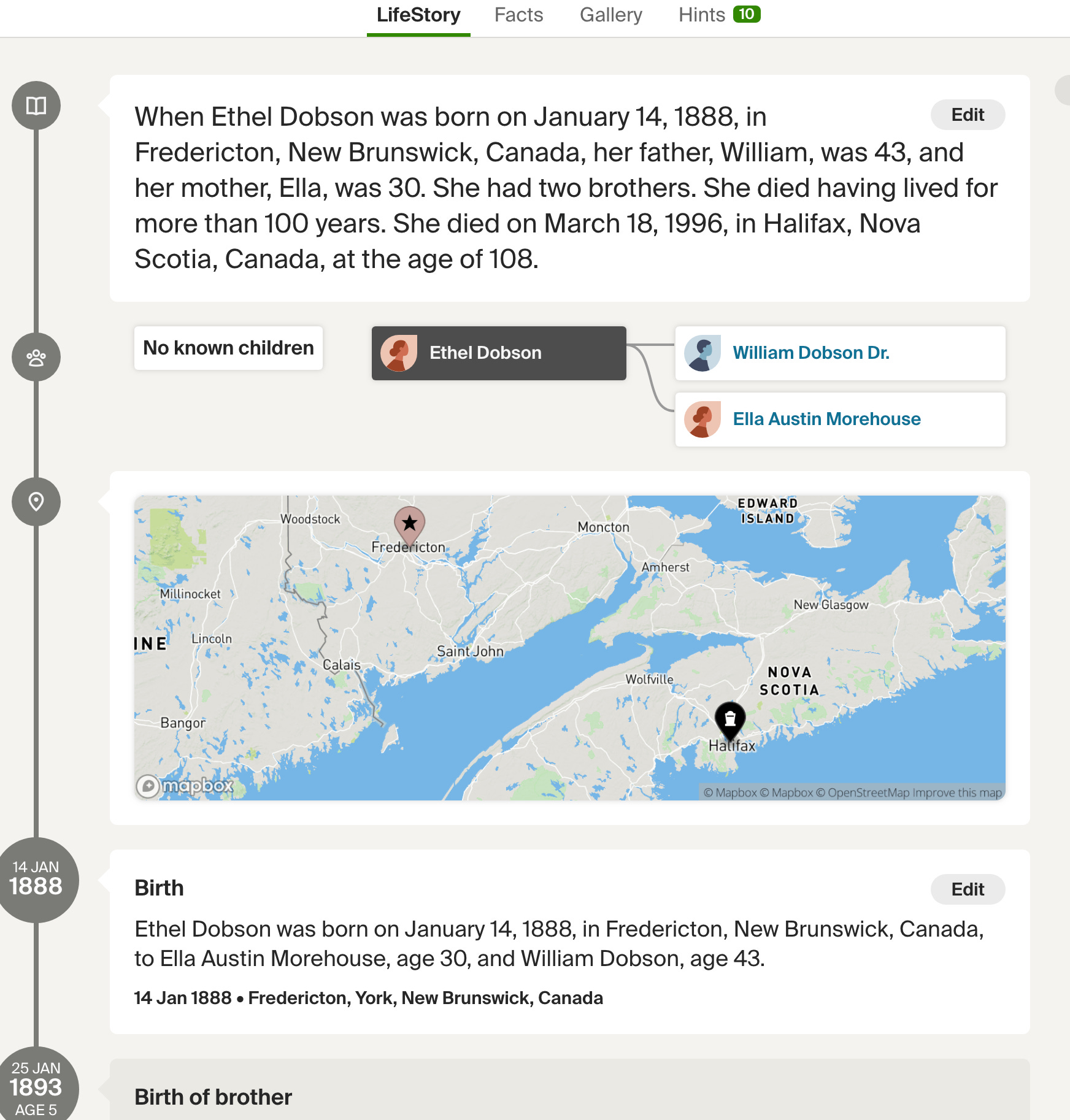 One of ancestry.com’s features is called LifeStory where the tool builds up a timeline of the life of a given person on the tree. Users are encouraged to fill in more details about a person to make the story richer. Here’s an example of part of my great aunt Ethel’s story: