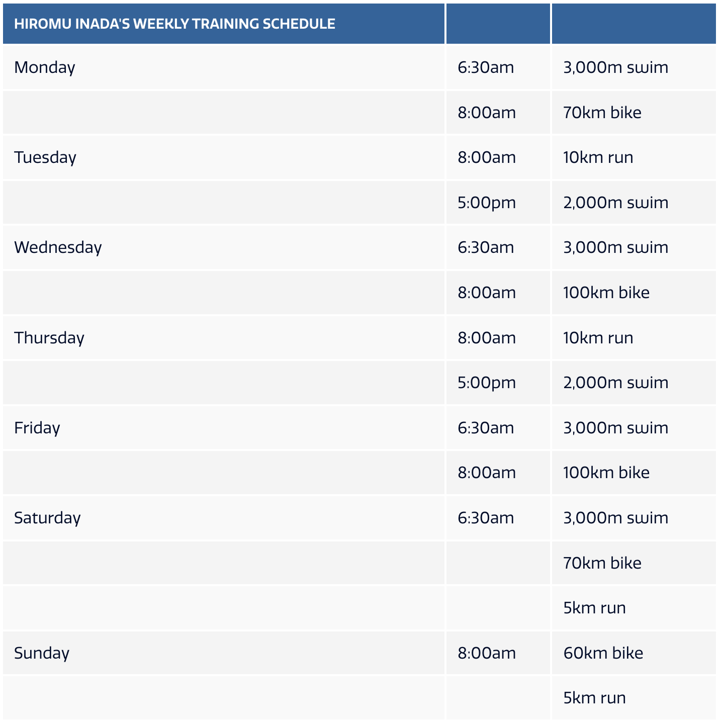 Inada-san’s training week, copied from Triathlete.com