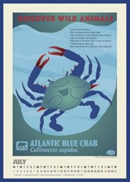 Blue Crabs. Like many, Minette and I always have a wall calendar hanging in the kitchen: usually something with pictures of Nature or Art. As a child our family’s monthly calendar was always hanging beside the telephone, assiduously filled with important dates by my Mother. In as much as it’s possible to call a paper calendar ‘anachronistic’, these days it does still seem like a bridge to the past. The rotary phone hanging on the wall is gone; perhaps the physical calendar will soon be replaced by a smart device.
