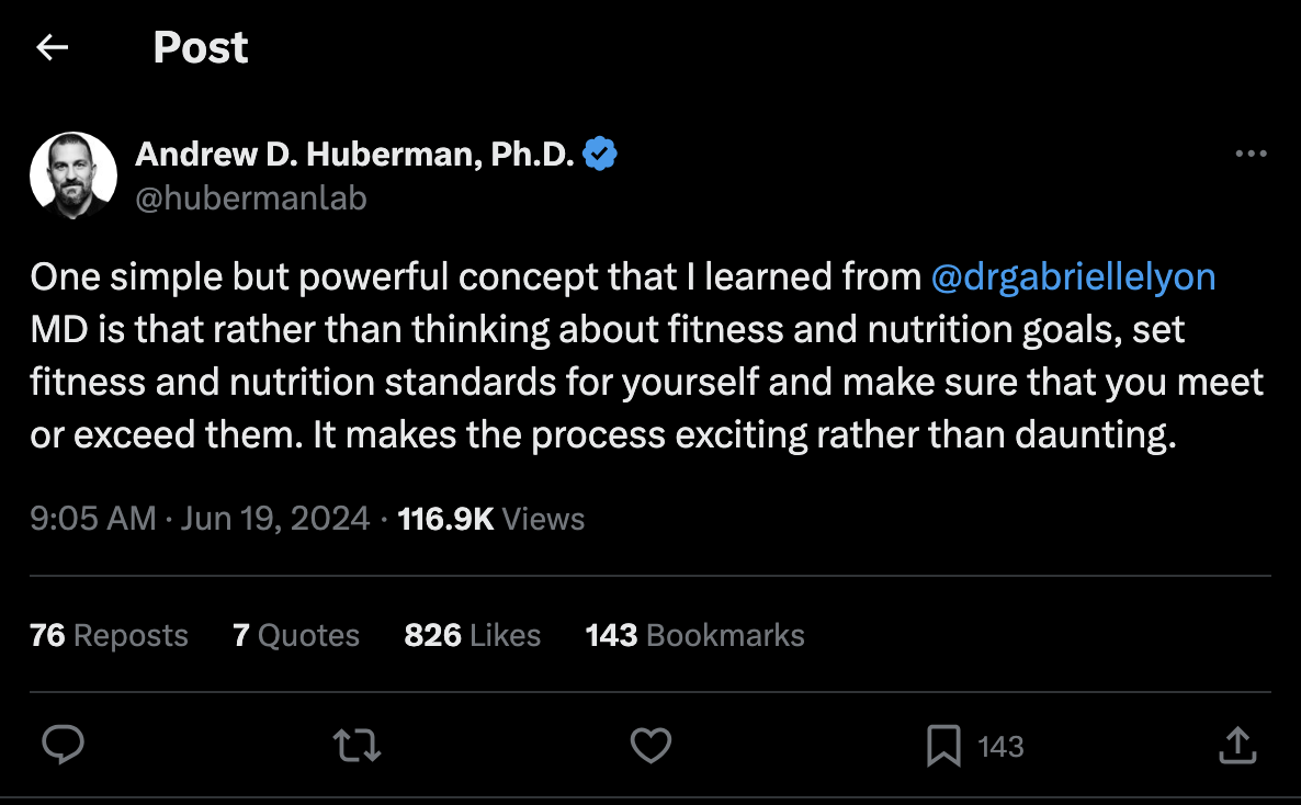 I am fascinated by this idea from a recent Dr. Andrew Huberman podcast with Dr. Gabrielle Lyon: work on fitness and nutrition standards for yourself instead of goals: